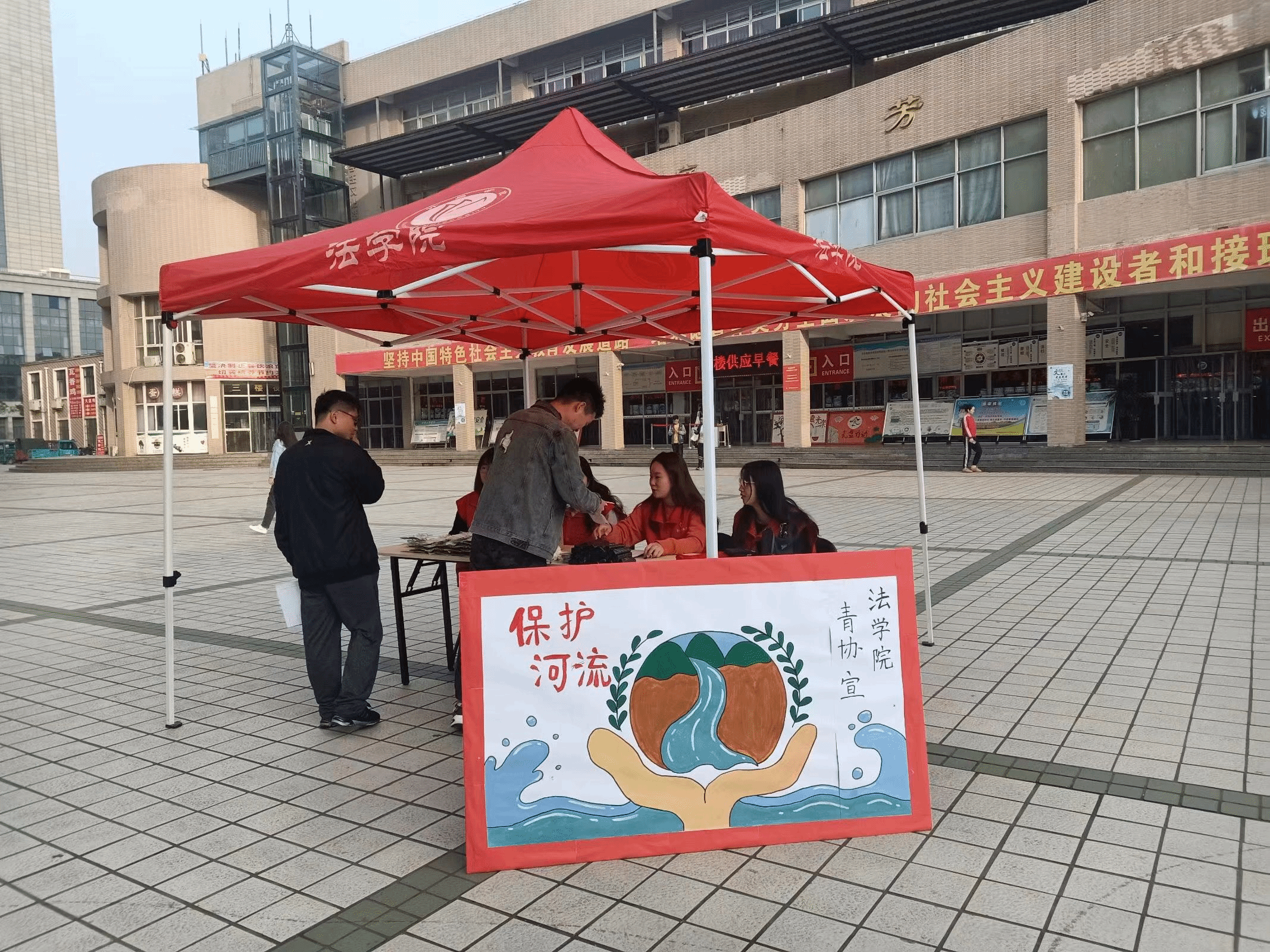 为了深入学习贯彻习近平生态文明思想,推进落实“美丽中国、青春行动”实施方案,2020年10月18日,许昌学院法学院青年志愿者协会“一路有法”河小青志愿服务队在满庭芳餐厅前开展了以“保护环境和河流”为主题的知识宣传问答活动,让环保意识与你我同行!