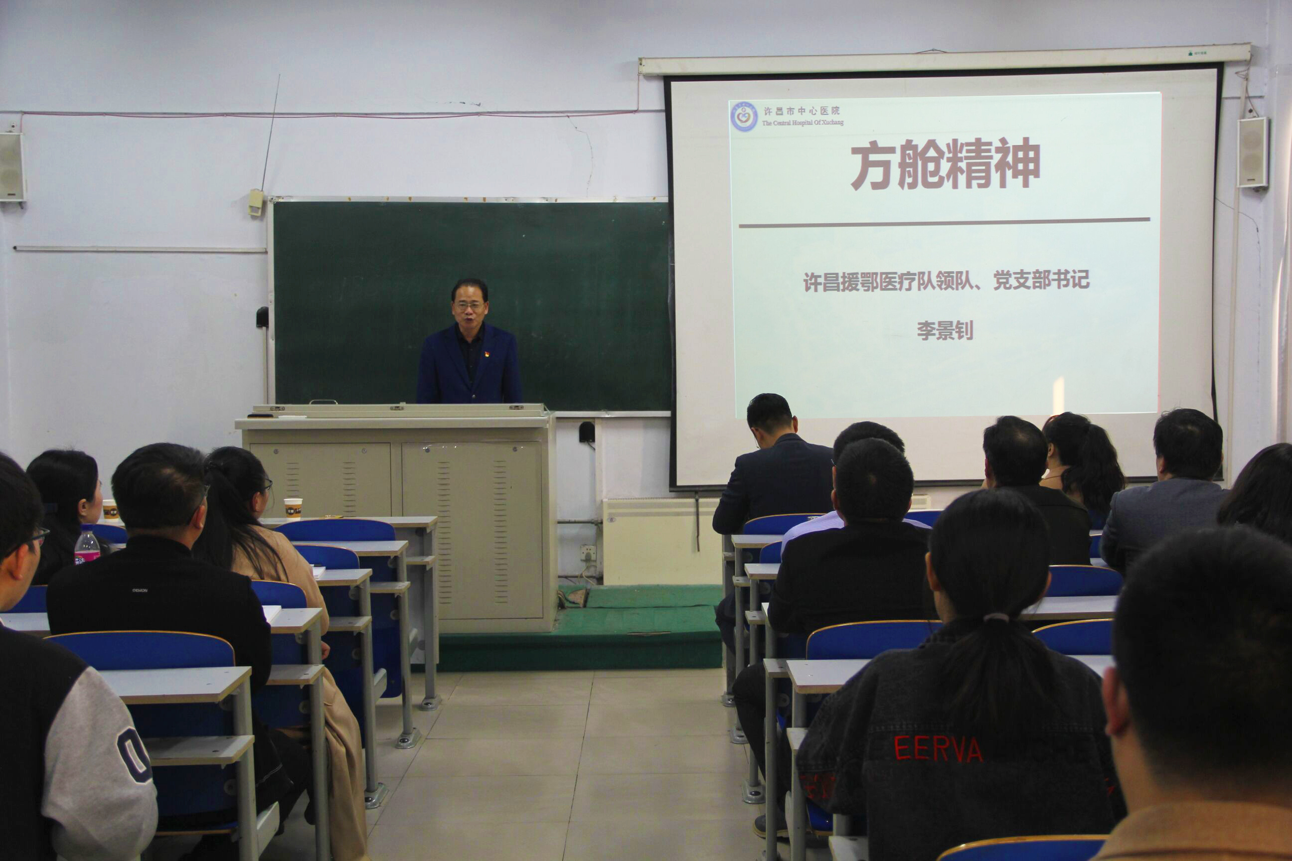 李景钊主任作为许昌市援鄂医疗队队长和河南第八援鄂医疗队队长,结合抗疫一线战斗经历做了“方舱精神”主题授课。他从什么是新冠病毒讲起,用一幅幅鲜活的照片,一段段朴实真挚的话语,再现了在党的坚强领导下“战武汉、为人民”的感人经历,用临危不惧迎难而上的大无畏精神充分诠释了一名共产党员“勇于担当、不辱使命”的初心与使命。因援鄂成绩突出,李景钊同志被省委组织部、许昌市委组织部和河南省卫健委通报表彰为表现突出的共产党员。