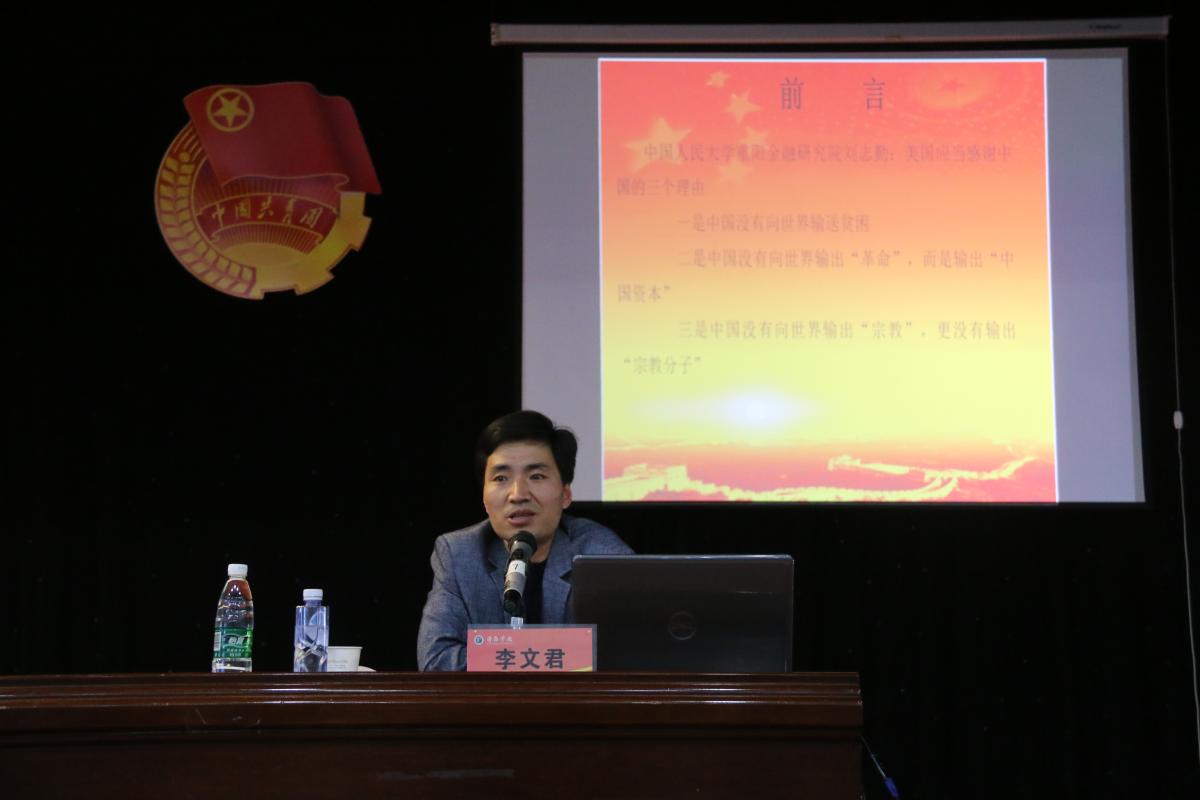 4月13日,上午八点,校党委统战部部长王林以法治思维的养成为主题,以社会主义法治体系为切入,详细论述了法治思维在当今中国的重要性,以及青年掌握法治思维的必要性,王林部长强调“法治思维是基于法治的固有特性和对法治的信念来认识事物,判断和解决问题的重要思维方式,法治思维的培养对扣好人生的第一颗扣子有重要现实意义”。随后,马克思主义学院张居正老师以中美贸易摩擦以切入点,介绍了国际上的风云变幻和中国的建设成就,准确理性的分析了中美贸易关系由互补到竞争的转变,张居正老师警示同学们,要有强烈的忧患意识,革命没有结束,我们仍需奋斗。