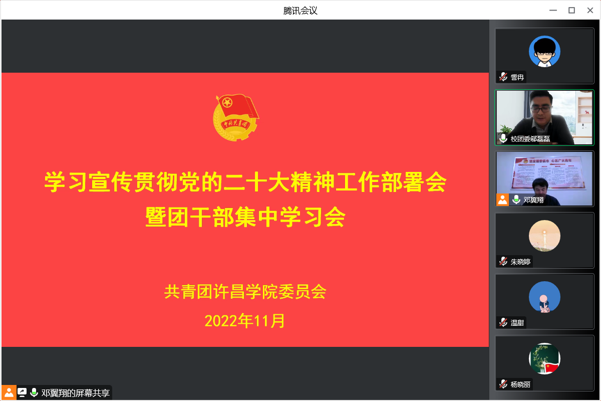 11月17日下午,我校共青团以线上会议形式组织召开党的二十大精神团干部集体学习会。由我校团干部朱晓婷、温甜、韩彦航、訾冉、姚婷玉、杨晓丽等6名同志组成的两支学习贯彻党的二十大精神河南青年宣讲小分队,围绕党的二十大精神为全体团干部作主题宣讲。