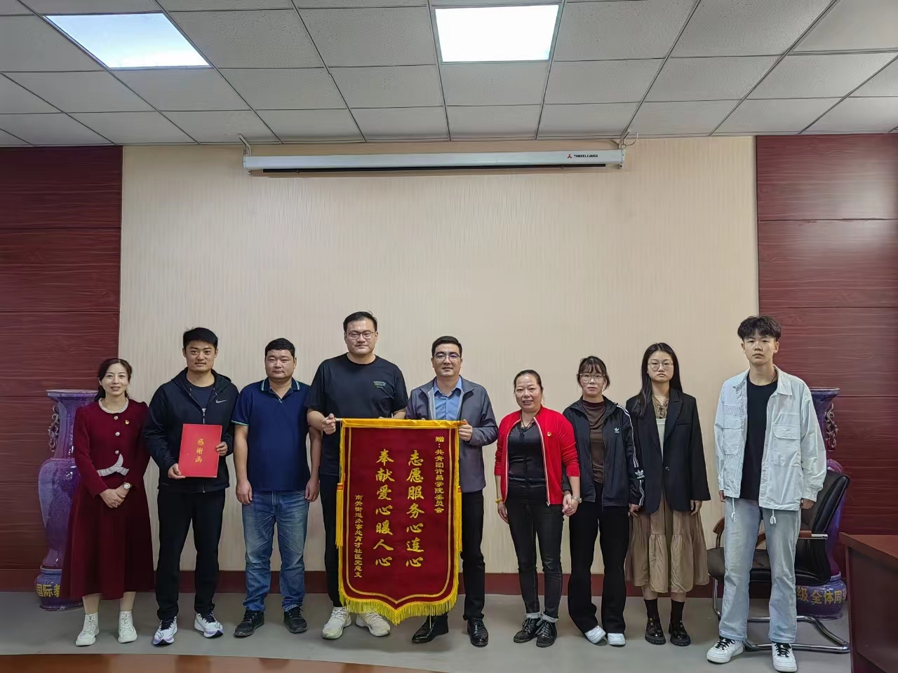 会上,校团委副书记郗磊磊传达上级团组织有关工作要求,并详细解读《关于开展2023-2024年度大学生社区实践计划的通知》,对学校大学生社区实践计划工作进行安排部署。育才社区党支部书记李艳娜代表结对社区对学校大学生社区实践工作给予了高度的评价和认可,她希望进一步强化对接合作,共同打造优质品牌项目,为广大同学提供更加有利的成长环节和成才空间。国际教育学院团委副书记张亚辉代表结对团组织发言,他表示要更好利用社区实践育人载体,更加突出青年大学生社会化能力的培养。会后,育才社区党支部书记李艳娜代表社区向学校师生送锦旗和慰问物品。