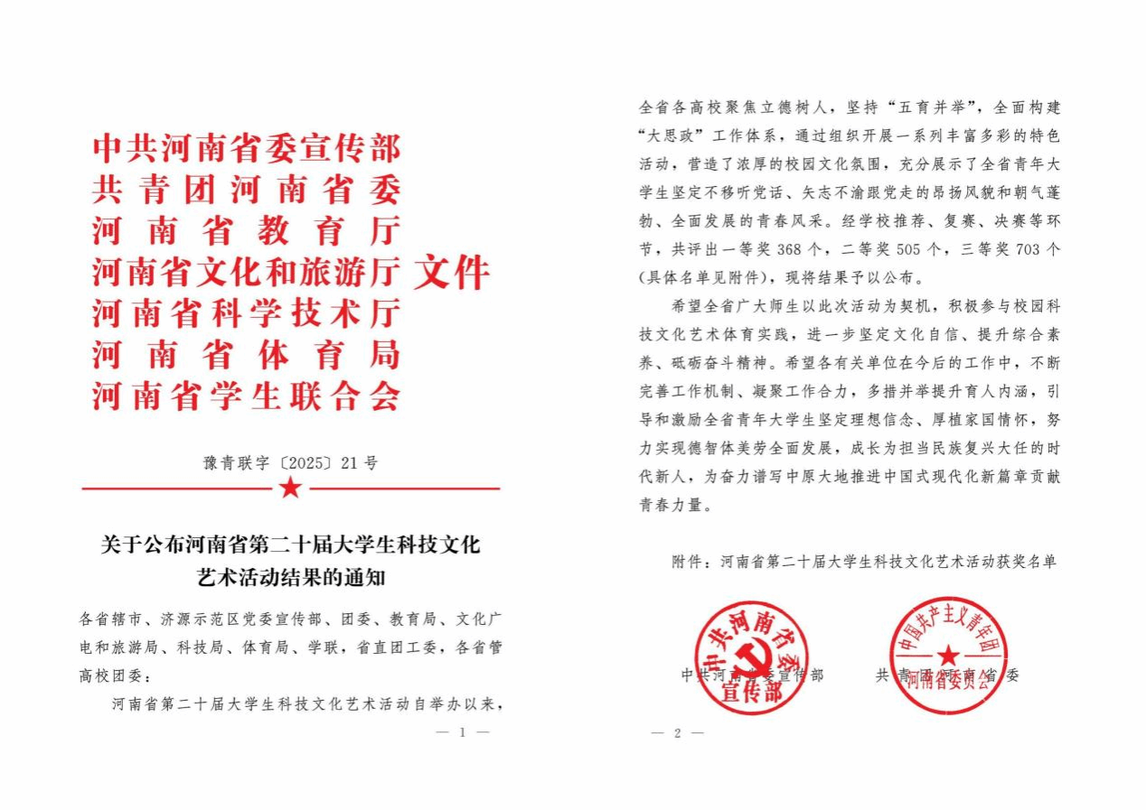 近日,由中共河南省委宣传部、共青团河南省委、河南省教育厅、河南省文化和旅游厅、河南省科学技术厅、河南省体育局及河南省学生联合会共同举办的河南省第二十届大学生科技文化艺术活动结果公布,我校共13项作品获奖。