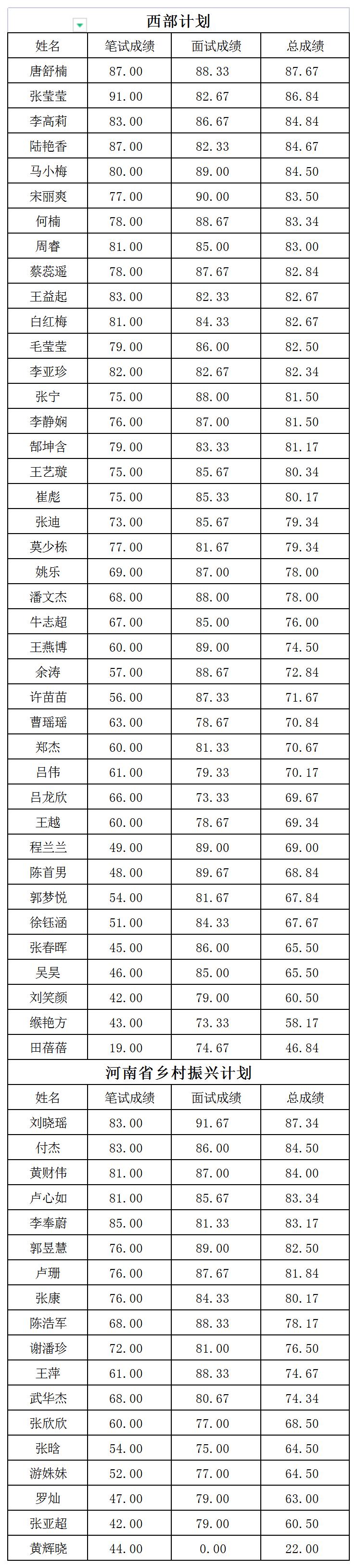 根据河南省大学生志愿服务西部计划省项目办的有关要求,按照公正、公平、公开的原则,经公开招募、自愿报名以及笔试面试等环节,现将许昌学院2022年大学生志愿服务西部计划选拔成绩进行公示。本次考试总成绩按照笔试成绩50%+面试成绩50%计算。公示期为2022年5月30日至6月3日,公示期内如有异议,请通过电话或以真实署名书面向大学生志愿服务西部计划学校项目办(行政楼429)反映,逾期不予受理。