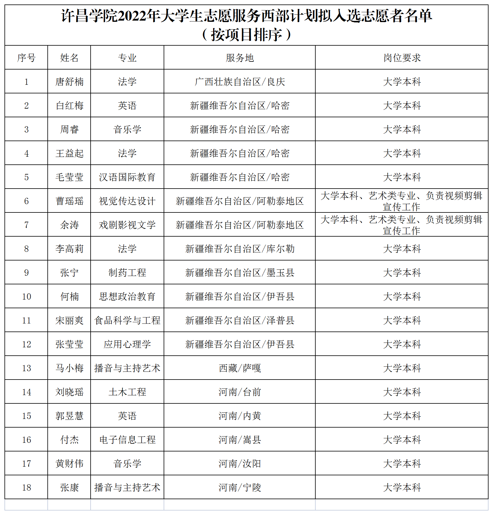根据《关于印发<2022—2023年度大学生志愿服务西部计划实施方案>的通知》(中青联发〔2022〕2号)、《关于做好2022年河南省大学生志愿服务乡村振兴计划工作的通知》(豫青联字〔2022〕12号)和2022年河南省西部计划志愿者招募工作的有关要求,学校西部计划项目办认真开展了2022年西部计划志愿者的招募选拔工作。经个人报名,通过资格审查、笔试、面试、体检等环节,按照河南省项目办下达岗位指标数及岗位要求,现拟录取唐舒楠等18名同学为我校2022年西部计划、乡村振兴计划志愿者。现对拟入选志愿者信息进行公示。