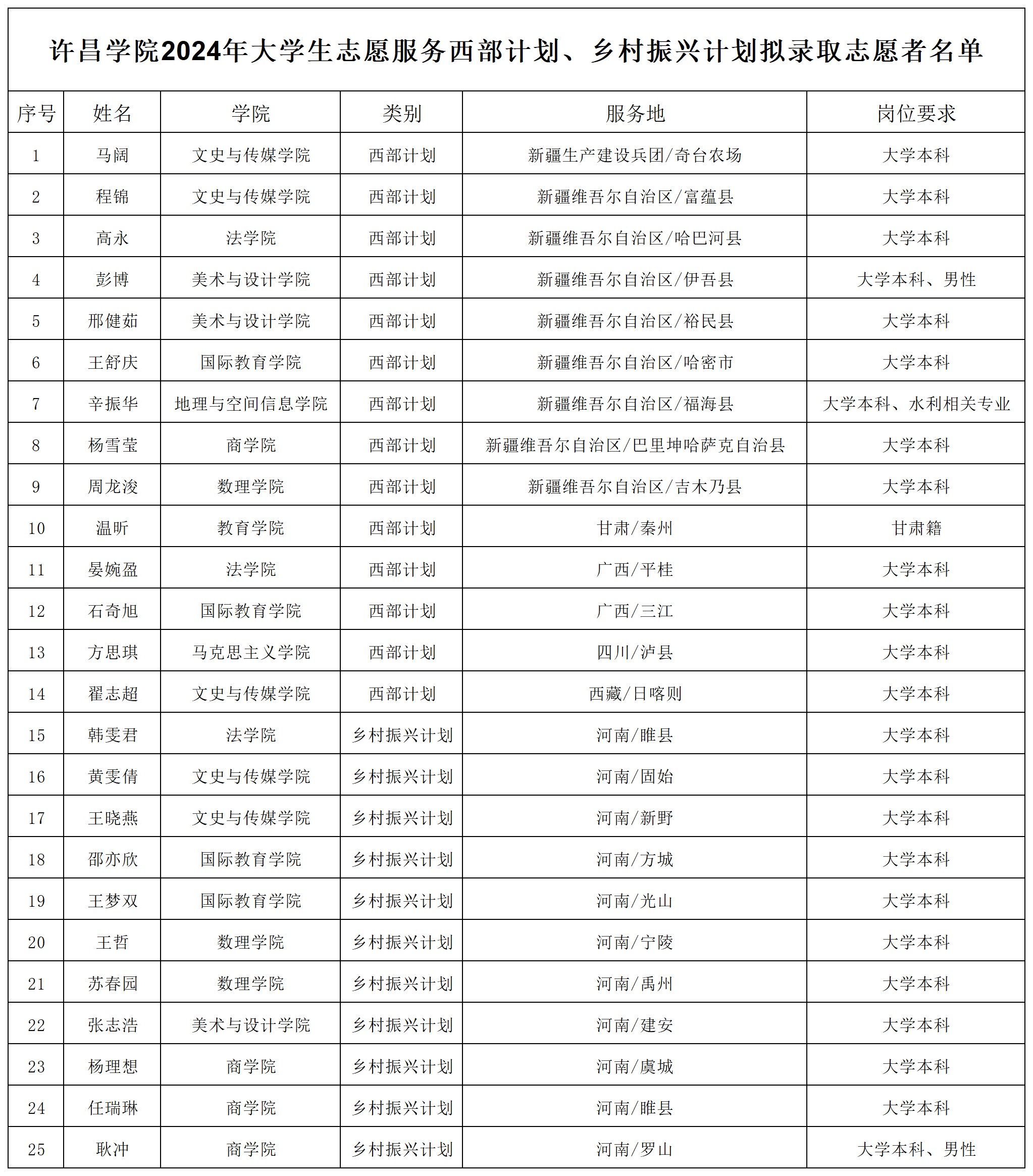 根据《关于印发<2024—2025年度大学生志愿服务西部计划实施方案>的通知》(中青联发〔2024〕2号)《关于做好2024年河南省大学生志愿服务乡村振兴计划工作的通知》(豫青联字〔2024〕16号)和2024年河南省西部计划志愿者招募工作的有关要求,学校西部计划项目办认真开展了2024年西部计划志愿者的招募选拔工作。经个人报名,通过资格审查、笔试、面试、心理测试、体检等环节,按照河南省项目办下达岗位指标数及岗位要求,现拟录取马阔等25名同学为我校2024年西部计划、乡村振兴计划志愿者。现对拟录取志愿者信息进行公示。